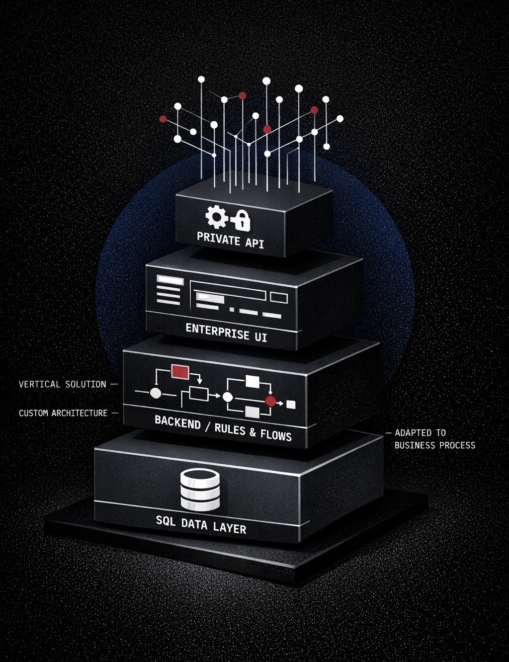 Tres fases: despliegue in situ para discovery, entrega de plataforma unificada a la medida, e implementación de agentes de IA sobre esa base. Sin genéricos; cada implementación se deriva del mapeo real de procesos y requisitos del cliente.